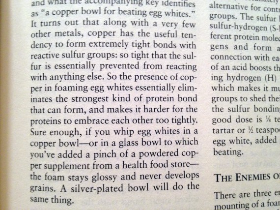 It’s hard to explain, but since acquiring copper, our whites are…creamier. Glossier. Almost, even, a little denser. And perfect for this cake. Curious, we turned to the the inimitable Harold McGee, whose The Science and Lore of the Kitchen is a staple in our kitchen, to understand why. Look!