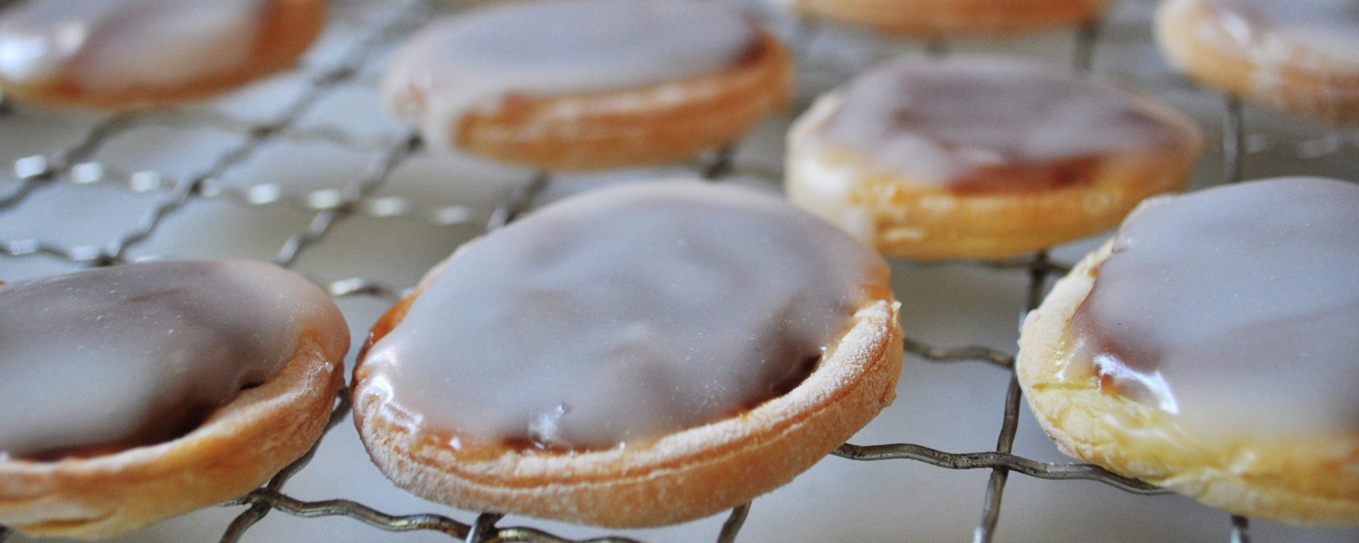 9. And lastly, coat the top of each cookie with fondant. The tricky thing with the fondant is that it has to stay warm, or it will seize up. Melt the fondant in a bain-marie on the stove, and leave it simmering as you work. Add 1 tablespoon and 1 teaspoon of hot water, and whisk. You want the fondant to be thin and runny, to make coating easier. Stir the fondant often as you work, and add hot water by the teaspoon as needed (the water will evaporate over time, so depending on how long it takes to coat the cookies, you’ll likely add water two or three times.)