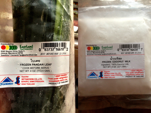 The recently-discovered Bangkok Center Grocery has been an unending source of tasty surprises. First, it carries tamarind candies, which we attempted to make ourselves back in March. And second, it has fresh pandan leaves and frozen coconut milk!