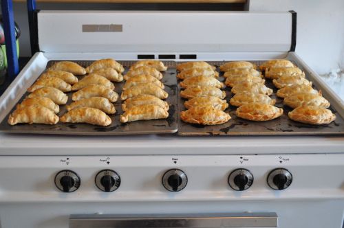5. Line a cookie sheet with parchment paper, and lay your empanadas out in rows. Refrigerate the trays for at least an hour, to help rest the dough and firm up the fat. Baste the empanadas with a beaten whole egg before baking, and bake at 400F for 25-30 minutes until golden. If baking multiple trays at once, rotate the pans in the oven at 20 minutes.